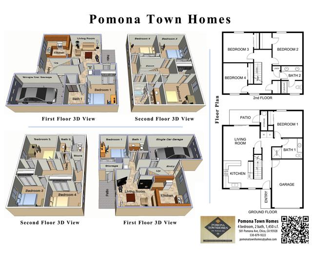 View Property Web Site Apartment Student life doesn’t have to mean cramped dorm rooms and never-ending queues on laundry day. Say good-bye to communal bathrooms and hello to Pomona Townhomes! Redefine your notion of off-campus living thanks to its modern amenities, spacious layouts, and excellent location. Browse through our collection of furnished or unfurnished four-bedroom townhomes in Chico and enjoy the perfect blend between comfort and privacy.